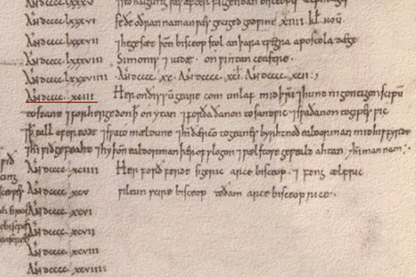 This page from the Anglo-Saxon Chronicle (Winchester MS) records the entry for AD 993, and begins "Here in this year Anlaf [Olaf] came..." In the column on the left, one can see that the years were written out first and a single line set aside for each. With the arrival of the Vikings, however, the chronicler was obliged to make room for that year's entry by erasing some of the numbers and writing over them. Still, there was not enough space and he continued his account in the margin.