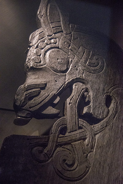 In 1025, Denmark and southern Sweden were ruled from England by Cnut the Great (whose father Sweyn Forkbeard had conquered that country a dozen years before), Norway by Olaf Haraldsson (St. Olaf), and Sweden by Anund Olafsson (baptized "Jacob," the Swedes objected to a name that had not been used before for a Swedish king). Cnut claimed sovereignty over Norway as well, prompting a war with Olaf and Anund, his brother-in-law. Both invaded Denmark, Olaf taking his fleet in the Bison, which had been constructed the previous winter; "as its figurehead it had the head of a bison, all gilded' (Saint Olaf's Saga, CXLIV). They ravaged the countryside, harrying the people until "most of them assented to all the conditions laid upon them in order to buy peace for themselves" (CXLV). Cnut levied his own men and ships, and sailed from England. "He had a tremendous force and huge ships. He himself had a dragon ship so large that there were sixty rowers' benches in it. It had gilded figureheads. Earl Hákon had another dragon ship, with forty rowers' benches [the same number as Roskilde 6]. It also had a gilded figurehead, and the sails on both ships had stripes of blue, red, and green. All their ships were painted above the water line, and all their equipment was of the best" (CXLVII). Later that year (or more likely in 1026), the two fleets confronted one another at the Battle of Helgeå, the "Holy River" somewhere in Scania in southernmost Sweden, possibly at Hanö Bay on the southeastern coast.