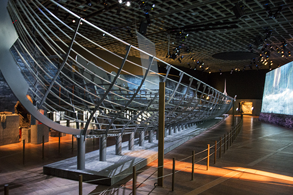 There was some question whether ships of thirty-four or thirty-five oars on a side (more than twice the number of the Gokstad) actually existed in the Viking Age, especially since the Heimskringla (from which the sagas of Olaf Tryggvason and Olaf Haraldsson have been taken) was written two hundred years later, when Viking longships had become considerably larger. But then in 1996–1997 a longship was discovered at Roskilde, Denmark that is estimated to have had as many as thirty-nine or even forty oars on a side. Constructed in about 1025, Roskilde is the longest Viking ship yet known and measures approximately 122 feet in length (the keel alone is 105 feet long and constructed in three sections) and thirteen feet in width. Designed to transport as many men as possible, Roskilde 6 is almost ten times longer than it is wide, its great length, narrow beam, and shallow draft (only 2.7 feet), allowing it to get close enough to the coast that the men aboard easily could wade ashore. A shorter distance between the thwarts (2.5 feet), although cramped, also permitted more men at the oars, which in turn made for a faster and more maneuverable ship. Only twenty to twenty-five percent of it survives, however, which now is supported by a special steel frame that gives some idea of its size (above, in the National Museum, Copenhagen).