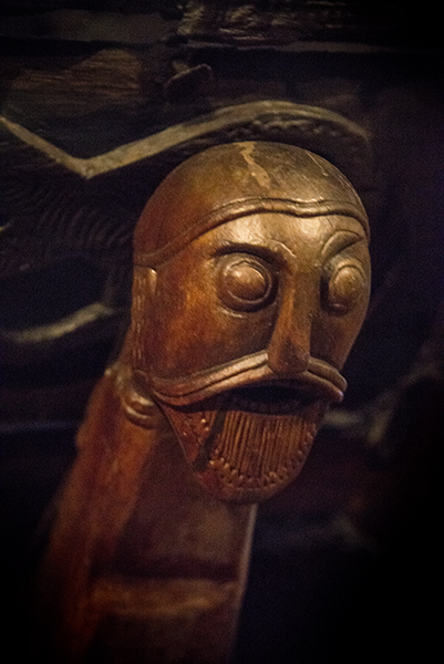 The carved figure of a Viking warrior is one of the finials to the cradle on a beautifully decorated wooden cart recovered with the Oseberg ship.