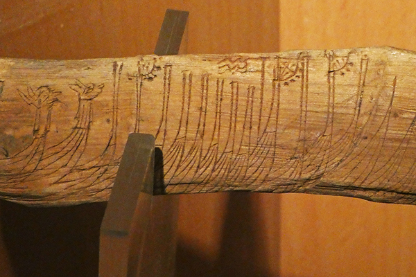 That holes along the curved edge of the vanes held streamers or some other decoration can be seen in several graffiti, some of which were scratched on the inner walls of the stave churches at Urnes and Borgund. More readily visible is the Bryggen ship-stick, a piece of juniper wood found in the medieval harbor of Bergen, Norway, and incised sometime between 1248 and 1332, given the stratum in which it was found. On the back is a runic inscription that reads "Here goes the sea-brave." Altogether, forty-eight longships are represented, as if resting at anchor. Whether they are shown in perspective, order of importance, or simply that the decreasing size represents smaller boats is not known. The strakes are clearly depicted, as are vanes prominently attached to the prows of several ships.