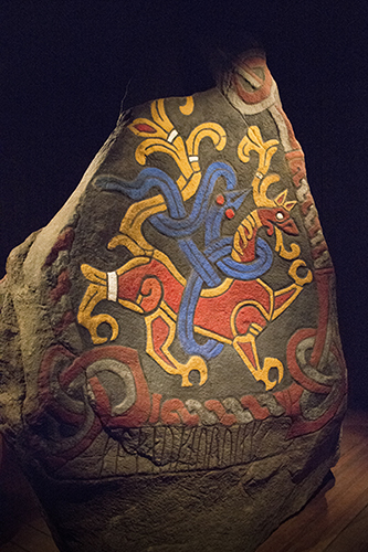 In the Heggen vane, an eagle is intertwined with a serpent; in the Söderala vane, a lion is entwined—as it is on the reverse of the Källunge vane. They all derive from the lion and serpent fighting on the Jelling stone. Art historians consider this rendering of the "Great Beast" iconographic in that it provided "the literal prototype for all single, large, lion-like animals which appear in Ringerike stone carvings" (Wilson, p. 134). As can be seen, the lion is spiral-hipped and has a lappet (fold of skin) at the lip and springing from its head. The lappet tail, too, develops into an acanthus-like pattern. The serpent presumably is a symbol of evil, possibly after Midgard, the mythological snake that encircled the world. (Although brightly colored in this reproduction, the colors have long faded from the original stone, which now is protected by a glass enclosure in a churchyard in Jelling, Denmark.)