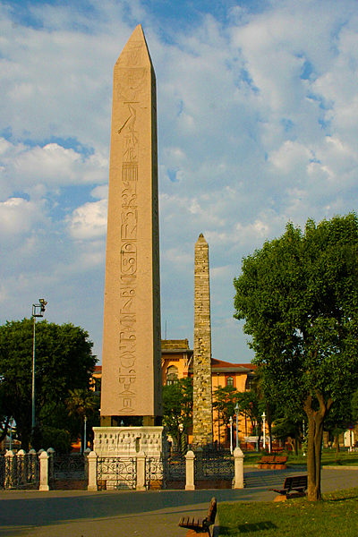 In the background is a second monument, that of Constantine VII Porphyrogenitus. Presumably, it was installed after the obelisk of Constantius had been erected in Rome, so that Constantinople, as successor to that city, would have a second monument as well. And, as the obelisk of Augustus occupied the center of the spina, so the obelisk of Theodosius marks the central position of the Hippodrome. That it does not appear to be so placed is because the curved end of the course (the Sphendone) is farther down the track, now almost obscured by the buildings of the modern city.