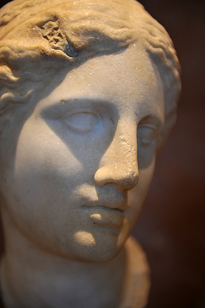 Of the many copies of the Aphrodite by Praxiteles, the Kaufmann head (150 BC) in the Louvre is considered to be the most accurate. Discovered at Tralles in western Asia Minor late in the nineteenth century, it was purchased by the Louvre in 1951. The portrait has a gentle countenance that is characterized by the soft gaze of the eyes remarked upon by Lucian.