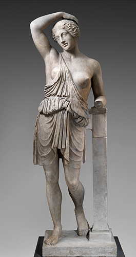 Discovered in the Gardens of Sallust in 1868 and acquired by the Pergamon Museum in Berlin the next year, this is the most complete example of the Lansdowne type—which is to say, the most restored. Almost all of the right arm and the left forearm, both hands and feet, and the pillar and its plinth have been replaced. More tired than suffering, the Amazon leans on a pillar for support, one hand draped rather listlessly, the other resting languidly on her head, the fingers slightly lifted.