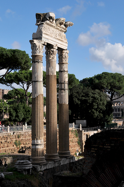 The area was damaged by the fire of AD 80 and the temple rebuilt by Domitian (as can be seen in the Flavian style of the cornice). It was rededicated by Trajan in AD 113, the year his own forum was dedicated. The columns and entablature that were re-erected in the 1930s belong to that restoration. The rest of the forum lies in ruins.