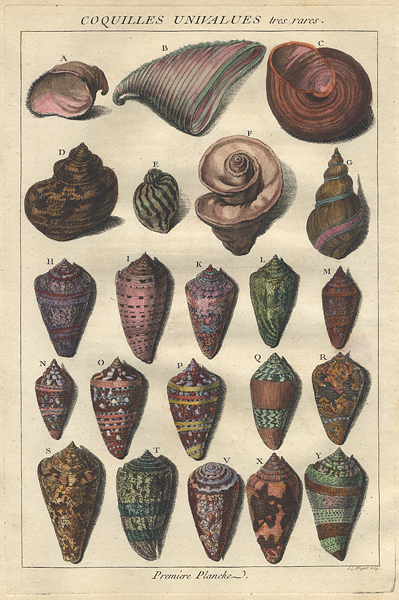 A bibliographic note: In 1758, in the tenth edition of the Systema Naturae, Carl Linnaeus sought to enumerate and describe every plant and animal known to him, each to be uniquely identified by two latinized words (its binomen), the first indicating the genus to which the organism belonged, the second, the species. But as revolutionary as this system of binomial nomenclature was in classifying species, it had not been practical for Linnaeus to illustrate his work. Instead, shell collectors in the eighteenth-century had to depend on others, such as Seba or Regenfuss, whose work also appeared that year, or d'Argenville and Knorr, who had published the year before.