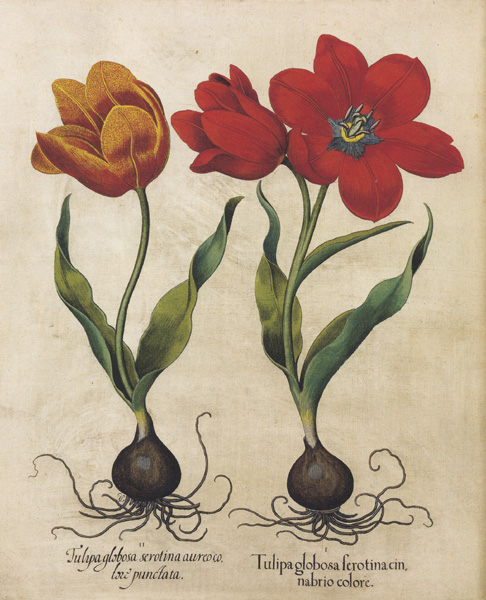 Later, as the tulip became known throughout Europe, there was increased interest in growing the plant for show, the rarer variegated flowers becoming a sign of prestige and status in the gardens of the wealthy. The illustration of these flowers were made all the more inviting by the use of copperplate for engraving, rather than woodblock. The picture (top) comes from the Hortus Eystettensis (1613), which preserves a record of the garden at Willibaldsburg Palace near Eichstätt. Engraved on copperplates (most of which have been preserved) and, in a later edition, colored by hand, the Hortus Eystettensis is regarded as a masterpiece of botanical illustration.