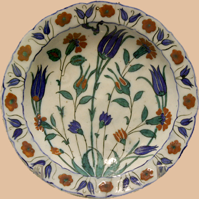 Using the same characters as the name of Allah, lale often was both a religious motif and an emblem of the Ottoman emperors. Celebrated by the Turks since the eleventh century, the most favored tulips had a tall, thin body with narrow dagger-shaped petals ending in sharp points, as can be seen in this Iznik glazed ceramic plate. It dates from the last quarter of the sixteenth century and is in the Çinili Pavilion, a part of the Archaeological Museum of Istanbul.