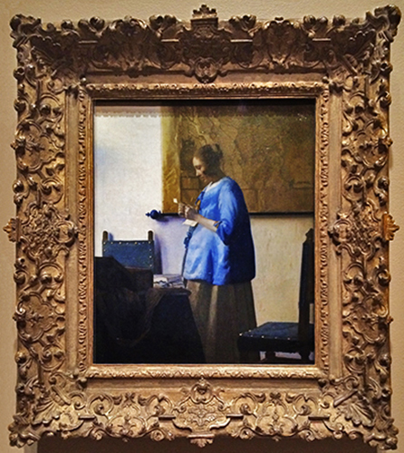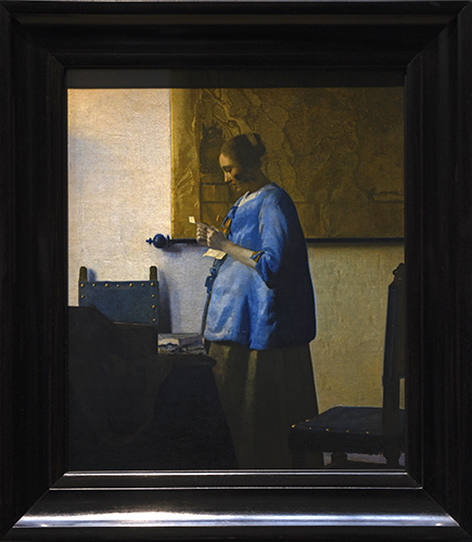 Now hanging in a dimly-lit gallery in the Rijksmuseum (Amsterdam), the painting looks as if it might have come from the wall of a Dutch burgher's canal-side house. On permanent loan from the City of Amsterdam, which was bequeathed the painting in 1847, it was moved to the Rijksmuseum in 1885, the first of four Vermeers to hang there. (When it was displayed in 2017 as part of a show at the National Gallery of Art in Washington, DC, the frame was exchanged for an elaborately carved gilded one, such being the mysteries of international art exhibitions.)