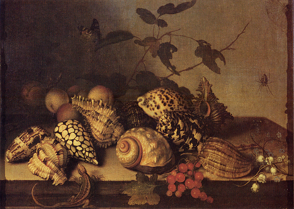 The most famous painter of pronkstillevens was Balthasar van der Ast, whose Sea Snails and Fruit (c. 1635) above is in the Gemäldegalerie Alte Meister (Old Masters Picture Gallery), Dresden. Two of the shells, which are so common now, are the Tiger Cowrie (Cypraea tigris) and Marbled Cone (Conus marmoreus), which Rembrandt etched in 1650.