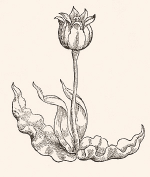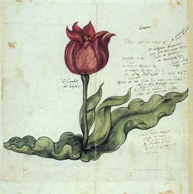 The first tulips in Europe were described by Conrad Gesner (1516-1565), a Swiss botanist and encyclopedias who had seen one in April 1559 in the garden of an Augsburg magistrate. "Tulip in the Garden of Johann Heinrich Herwart" (above) depicts what looked to Gesner like a red lily, which he called Tulipa turcarum. One still can read his scribbled notes about the flower. Two years later in 1561, the hand-colored drawing was published as a wood block print (below) in his De Hortis Germaniae Liber Recens, the first European illustration of the tulip.