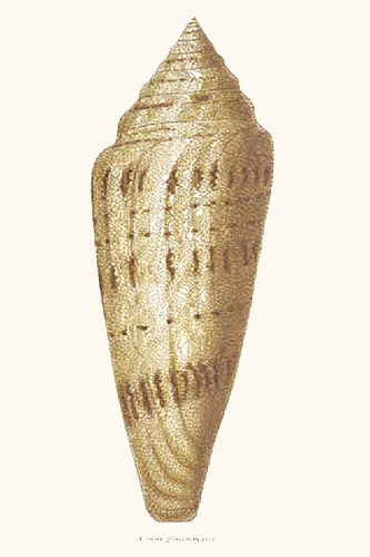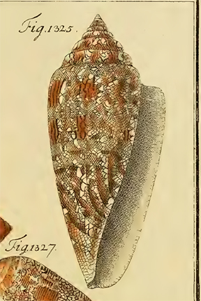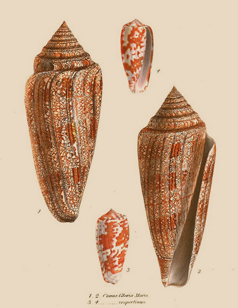 When Jean Guillaume Bruguière published the first volume of his Encyclopédie méthodique, histoire naturelle des vers in 1792, he relates on the last page that only four examples of Cone gloire de la mer then were known to exist in Europe. This superbe coquille was in "les cabinets de M. Lyonet, Moltke, Calonne et Hwass" (p. 757). The shell belonging to Pierre Lyonet also was mentioned by d'Argenville in La conchyliologie, where it is described as très-rare (p. 343). The one belonging to Moltke was the shell he had acquired at auction and lent to Chemnitz. D'Argenville also mentions this Gloria maris, remarking on its de sa beauté & de sa rareté (pp. 811-812). There is some confusion regarding the shell owned by Charles-Alexandre de Calonne, Controller General of Finance to Louis XVI, which possibly may have come from the estate of the Duchess of Portland. The last specimen belonged to Christian Hwass, whose description of Conus was edited by Bruguière in the Encyclopédie méthodique (p. 601).