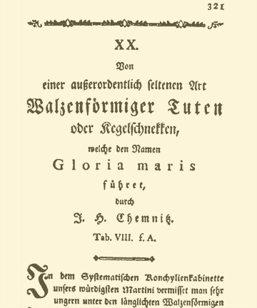 This is the title page of the article that gave Conus gloriamaris, Chemnitz 1777 its scientific name. The German translates as "From an extraordinarily rare species of cylindrical snails, which bears the name Gloria maris." Notice that the text is printed in Fraktur, a type of blackletter typeface that, with its many ligatures and abbreviations seems almost defiantly Teutonic, whereas Latin terms (such as Gloria maris) are printed in Antiqua, a Roman script.