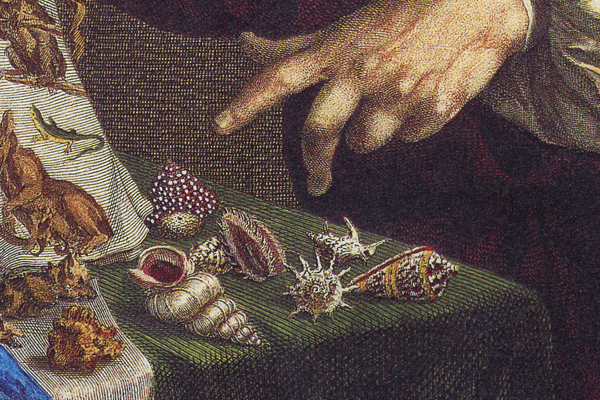 The earliest illustration of a shell is a wood-block print that appeared in 1475. Typically, shells drawn before about 1700 are presented as observed (recto). But, because they were not reversed on the wooden block or copper plate, the result is an inverted image on the printed page (verso). Dextral shells, which should have their aperture on the right, invariably are reversed and presented as sinistral, with the opening on the left, as are the shells to which Seba so proudly points in the print above. Still, there is no consistency; even though almost two-thirds of the gastropods illustrated in his Thesaurus are sinistral, the others are dextral.