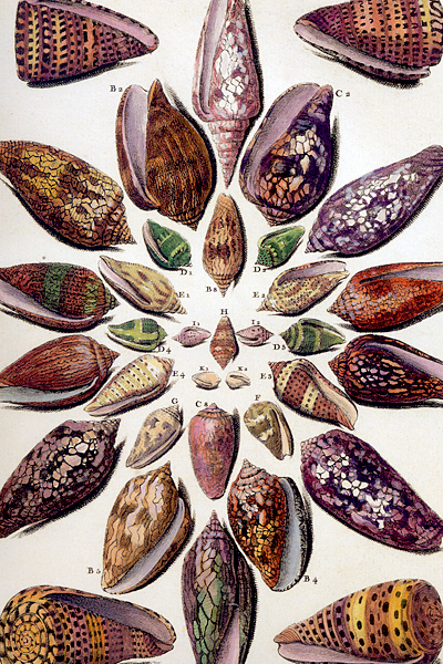 In this detail from d'Argenville's Conchyliologie (1780, Vol. I, Pl. XVIII), which has been hand colored (some rather imaginatively), one sees the elements of symmetry, variety, contrast, uniformity, and diversity that defined the nature of beauty and taste in the eighteenth century.