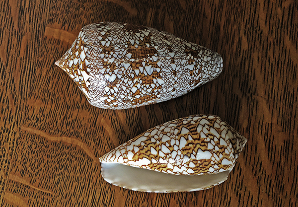 Certainly, the feathered pattern and white, red-tipped siphon are descriptive of both C. textile and C. omaria. And the "third or brown kind" is similar to C. geographus. But Rumphius identifies that shell as one of the Nubeculae (II.21.6), "somewhat knobby at the head...with a wide mouth, and a thin shell; the biggest kind is brown, with dirty white specks." These indistinct white clouds give the shell its name, "little clouds." C. geographus is illustrated in Plate XXXI as Figure G, where it is labeled as Agate Kroonbak or "Agate Crownscoop." Bak here is translated by Beekman as "scoop," suggesting that these shells, which "are very large and have wide mouths," were sometimes used to bail water. Whether Rumphius' third kind actually was C. geographus cannot be known, although Kohn suspects that it was, given how very quickly the native woman died. To be sure, the venom of C. textile, which hunts other mollusks, is not as toxic as a fish eater such as C. geographus, which also is more aggressive. But the victim could have been young and so more vulnerable to the sting of C. textile, or the "little Whelk" may have been an immature C. geographus.