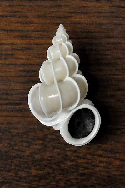 This is the first illustration of the Precious Wentletrap, which appeared in the Appendix to Rumphius' D'Amboinsche Rariteitkamer (Plate XLIX). There, its editor described the shell as having "only a nice white color, but its composition is wondrous, and cannot be imagined as such, the way it is in fact." Notice in the etching that the orientation of the shell, like so many prior to the eighteenth century, has been reversed, the dextral shell appearing sinistral.