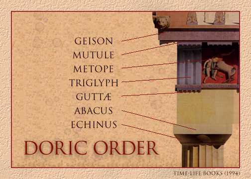 Vitruvius explains that the ornamentation of the Doric order, its metopes and triglyphs, mutules and guttae, derived from the original wooden construction of temples. "Artists in building temples of stone and marble imitated those arrangements in their sculptures, believing that they must follow those inventions." Just as carpenters cut off the projecting ends of the supporting beams and concealed them with boards covered with blue wax, so the triglyphs, adorned with three vertical grooves and painted blue, were used to separate the metopes, which were painted red. The mutules, too, under the geison imitate the projecting rafters of the roof and are carved with the same downward slant that originally allowed water to drip down. The peg-like guttae represent wooden dowels.