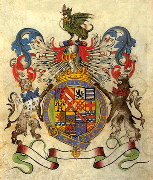 This full achievement illustrates the Azure, Gules, and Ermine mantling issuing from the twisted wreath on the helmet, silver with gold bars, signifying the earl to be a peer, and surmounted by a wyvern crest. The quartered shield is supported dexter by a panther rampant guardant, incensed; and sinister, a lion rampant, both of which are armed and collared. At the fess point is a Sable crescent, a difference denoting the second son. The coronet is that of an earl and has eight lofty rays (five visible), each topped with a pearl and alternating with strawberry leaves. Encircling the shield is the Order of the Garter, its motto reading Honi Soit Qui Mal Y Pense, "Shame be to him who thinks ill of it." Although a scroll is illustrated, there is no motto.