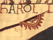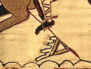 Supposedly the first flag flown in England to be fastened at the hoist, the legendary Raven Flag of the Danish Vikings was thought to portend the outcome of battle. The Anglo-Saxon Chronicle records that such a flag was captured in AD 878 by Alfred. It was carried, too, by Cnut in his victory at Ashingdon in 1016 and may be illustrated here at Hastings. It also is mentioned in the Encomium Emmae Reginae and the Annals of St. Neots, where it is said to have been woven by the daughters of Ragnar Lothbrok, the raven fluttering before victory and drooping before defeat. The English standard was the wyvern, a two-legged winged dragon, shown here lying on the ground in the scene depicting Harold's death. Thought to have derived from the figure of the dragon encountered by Trajan's legions in Dacia, it may be the origin of the red dragon of Wales and the golden dragon of the kings of Wessex, carried, says Henry of Huntington, at the Battle of Burford in AD 752. The dragon's tail is twisted and, like the tails on the fly of the papal banner shown above, demonstrates the same Anglo-Saxon fondness for the curvilinear. Flown vertically with tails at the fly, the pennon frequently appears in the Bayeux Tapestry, where it was carried at the head of a lance. Even though the early devices that decorate these war flags are not thought to be heraldic, they may very well be the prototypes of armorial bearings that were used when heraldry did originate less than a century later. Early in the twelfth century, the first example of arms on a shield is recorded, that of gold lions on azure, given by Henry I to his son-in-law Geoffrey Plantagenet when he knighted him in 1127. Either pointed or swallow-tailed at the fly, the pennon was carried at the head of a lance and, in the Middle Ages, served to identify the knight, who's armorial bearings it displayed, emblazoned so that they appeared correctly in the "at charge" position. Indeed, it is likely that the pennon was the first indication of a knight's cognizance. (A smaller version was the pennoncel.) "On the highest point of the summit he planted his banner, and ordered his other standards to be set up." So the Carmen de Hastingae Proelio, the earliest account of Hastings, relates Harold's preparations for battle. William of Poitiers says that "Harold's famous banner in which the image of an armed warrior was woven in pure gold" was sent to the pope in recognition of the papal banner given to William. Triangular and fringed, it may be depicted in the Bayeux Tapestry, lying on the ground in the scene in which Harold's brothers are attacked by mounted knights. Originally oblong, with a taller hoist than fly, and later nearly square, the medieval banner displayed the personal insignia of kings, nobles, and knights bannerets (those knights who were advanced on the field of battle had the tails of their pennons torn off to form a banner) and was a rallying point in battle. By the mid-fourteenth century, the standard had come to describe the official banner of royalty or nobility. (Whereas insignia are displayed the whole length of the standard, they are limited to the non-tailed area of the gonfanon.) Long, narrow, and tapered (what now would be called a pennant) and ending in a split end, if English, with the cross of St. George at the hoist and then the badge, crest, and motto of its owner (but not the arms), the length was determined by rank. Terminology still varies, however, as can be seen in a line from the twelfth-century Roman de Rou, a chronicle of the Norman conquest by the poet Wace: "The Barons had gonfanons / The Knights had pennons" (XII).