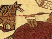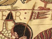 To see fair England's standards fly."The principal flag of the classical period was the legionary vexillum of Rome, a diminutive of the word velum or "sail" and the origin of vexillology, the study of flags. Hung by its upper edge or top corners from a crossbar supported by a staff or spear, the vexillum later takes the form of the gonfalon (or gonfanon in French heraldry), which was adopted in the Middle Ages by Italian republics and the church for use in ceremonies and processions. In this detail from the Bayeux Tapestry, Count Eustace carries the papal insignia of Alexander II, a gonfanon with three tails charged with a cross, which William of Poitiers says was given to William to signify the church's blessing of his venture.