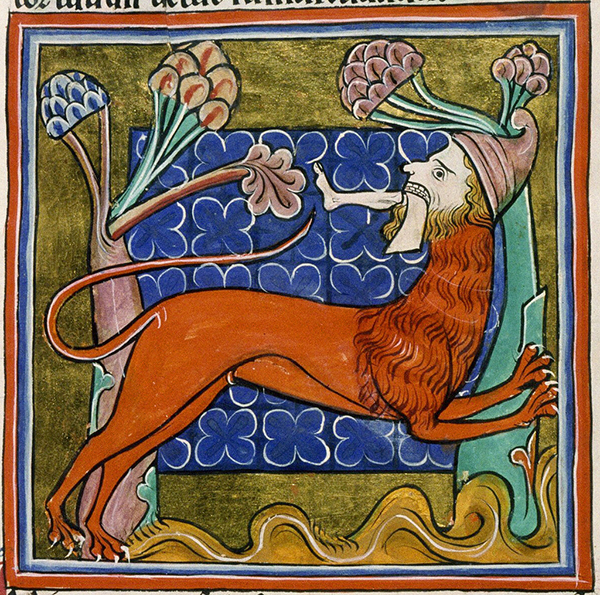 But Ctesias also relates the beast's more fantastic characteristics: the face, ears, and light-blue eyes of a human but with three rows of teeth, and deadly foot-long spines that shot like arrows from its scorpion-like tail, each growing back as soon as it had been released (which Harley MS 3244 attempts to depict as a single spine poised at the tip of the tail). It is this credulity that later so discredited Ctesias' pretensions as an historian. In the illumination from Bodley 764 (above), the mantichora has been portrayed with its lion's mane and red body, sharp claws and pointed tail—but also with a beard, hooked nose, and Phrygian cap to signify that the monster represented the Jew.