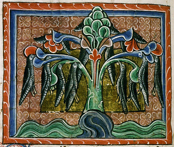 This illumination is from Bodley 764 and shows the barnacle goose described by Gerald of Wales suspended motionless by its bill (a similar picture illustrates Harley 4751, the only other bestiary in which the bird is included). Migratory, its Arctic nesting grounds never having been seen, the goose was not believed to lay eggs. Rather, it was thought to have developed inside a barnacle shell, generated there by the logs to which it was attached. Gerald remarks that he had seen thousands of these shells on timbers along the shore, imagining them to contain embryonic geese. Thus protected, the birds hung there until they acquired feathers and could drop into the water or fly away.