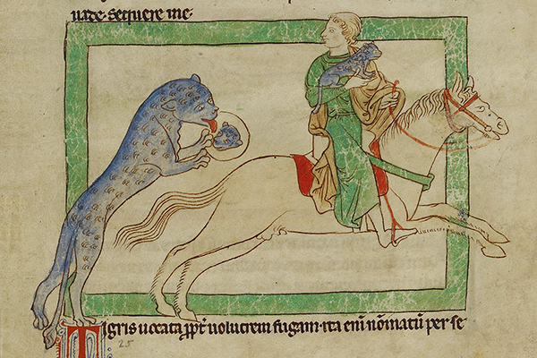 Women, too, are depicted in scenes that otherwise lack them (a noblewoman is shown hawking, for example) and, when animal species are presented, the female is shown more often than in other manuscripts. Bodley 764 would seem, therefore, intended to appeal to well-born ladies as well. And the tiger is unusual in that it is presented in its own panel, apart from the hunter. The moral, as the tigress stops to retrieve what she thinks to be her abandoned offspring, is that (as Barber translates) "the intensity of her motherly love betrays her, and deprives her of both her revenge and her cub."