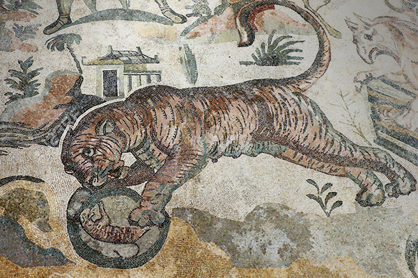 The tiger and her reflected cub (top) are from the "Great Hunt" mosaic at Villa Romana del Casale (Piazza Armerina, Sicily) and date to the first quarter of the fourth century AD, more than half a century before Ambrose wrote about his own simulacrum. Claudian composed his poem later that same century. Its allusion to the tigress' paramour being the West Wind alludes to the belief that an animal as swift as the tiger surely must have been impregnated by Zephyrus himself. Even though the gentlest of the four winds, he was the harbinger of spring, when animals most were wont to mate.