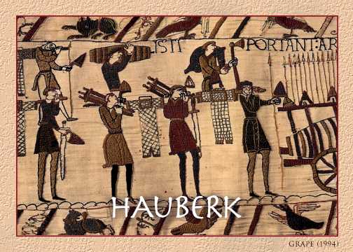 The Norman knight was protected by a hauberk, a heavy coat of mail comprised of interlinked riveted metal rings. Its Anglo-Saxon equivalent was the byrnie (the only examples of such mail are the corroded lump found at Sutton Hoo and the neck-guard of the Coppergate helmet). As can be seen in the illustration from the Bayeux Tapestry, the hauberk had short sleeves that left the forearms free and a slit in the skirt to facilitate riding. Normally, it extended into a coif or hood over the head, which also was protected by a conical helmet, hammered from a single piece of iron, with a separate noseguard (the men can be seen carrying helmets by the nasal). William also is shown wearing mail leggings called chausses. Sleeves of mail were worn as well.