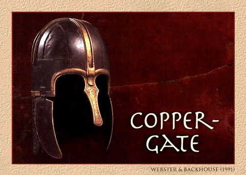 The helmet, which was found just outside the Coppergate archaeological site, dates from the eighth century. It is Anglo-Saxon in origin and may have been hidden deliberately. On the brass band across the crest of the iron helmet is an inscription in Latin that identifies the owner as Oshere and includes a short prayer invoking God's protection. There are two deep curving cheek guards and a curtain of ring mail to protect the neck.