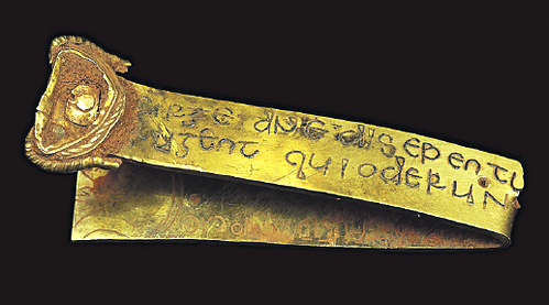 In September 2009, it was announced that there had been a remarkable discovery of Anglo-Saxon treasure in Staffordshire, once the ancient kingdom of Mercia. The largest hoard of Anglo-Saxon gold and silver artifacts ever discovered was scattered over a plowed field. The trove comprises some fifteen hundred pieces, including scores of sword hilt collars, pommel bosses, and fittings, as well as the remains of several helmets. The gold items alone, many filigreed and decorated with garnets, weigh about eleven pounds, more than three times the amount found at Sutton Hoo. The only non-martial items were several crosses, one of which had been folded for burial. There also was an inscribed strip of gold inscribed in misspelled Latin with a verse from Numbers 10:35, "Rise up, O Lord, and may thy enemies be dispersed and those who hate thee be driven from thy face." Declared treasure, the hoard becomes Crown property. Once evaluated, the proceeds from the sale will be split between the discoverer and landowner, and the items themselves likely divided between the Birmingham Museum and other venues.