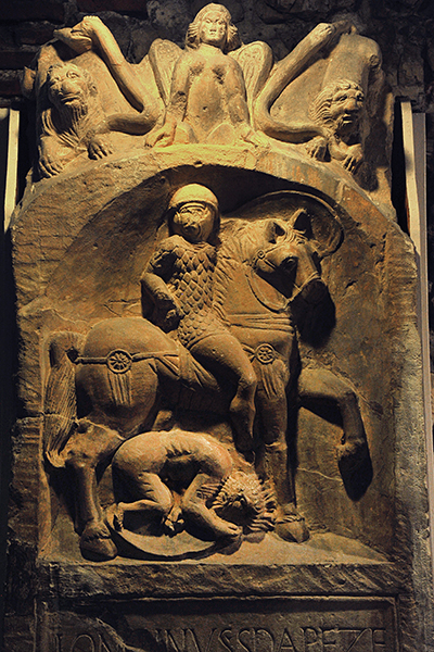 The tombstone above of Longinus Sdapeze, a Thracian auxiliary cavalryman, dates to about AD 60 and (together with that of Marcus Favonius Facilis) is the oldest Roman gravestone in Britain. After fifteen years in the Roman army, he died in Colchester at the age of forty, sometime between AD 43 and AD 49, when Legio XX was transferred and the military garrison became a colony. Indeed, it is possible that Longinus had arrived with Claudius and accompanied the emperor to Colchester.