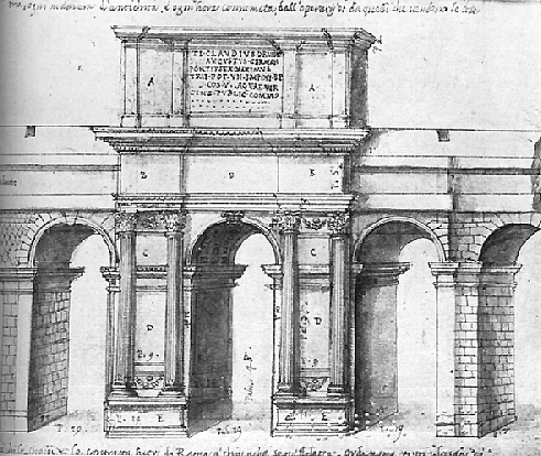 In this reconstruction by Pirro Ligorio (d.1583), one should imagine the equestrian statue and trophies surmounting the attic and a program of panel reliefs running on the architrave below it. Ligorio also indicates that reliefs flanked the attic inscription and the piers between the columns. Beneath the column bases were dedications to the imperial family. It is likely, too, that the inscriptions were duplicated on both sides of the arch, to be seen by travelers as they entered or left Rome.