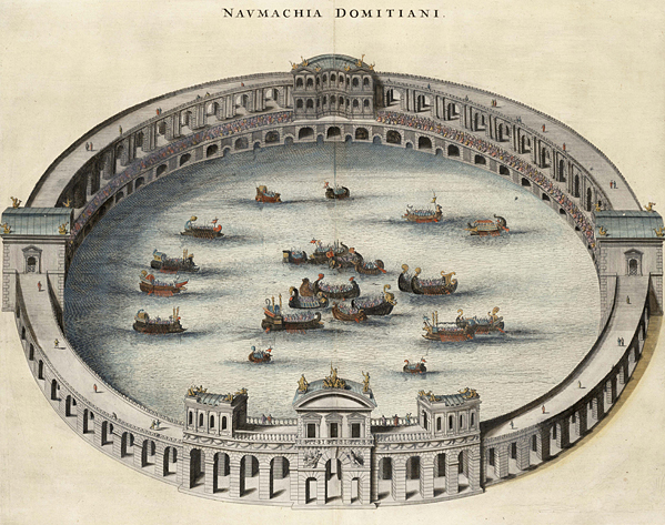 When Titus suddenly died in AD 81, he was succeeded by his younger brother Domitian, who "even gave a naval battle in the amphitheatre" (Suetonius, IV.1; about AD 85). Domitian also constructed the hypogeum below the floor of the Colosseum, a substructure of cells, passageways, and lifts almost twenty feet deep (cf. Herodian, who marvels "when a hundred lions appeared in one group as if from beneath the earth," History of the Empire, I.15.6). Suetonius records that the emperor later presented naumachiae "almost with regular fleets, having dug a pool near the Tiber and surrounded it with seats; and he continued to witness the contests amid heavy rains" (IV.2).