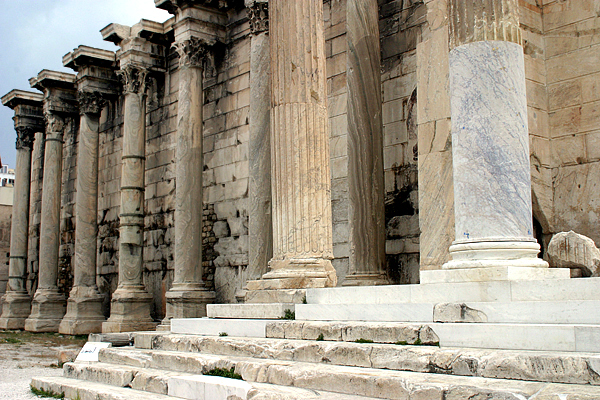 The entrance to the courtyard was through a propylon of four Corinthian columns of veined marble, as can be seen in the restoration above. Across the façade of the principal western wall, which is Pentelic marble, were fourteen Corinthian columns of green cipollino marble from southern Euboea. The seven on the left of the porch still survive and, like those in the Forum of Nerva, are en ressaut, the entablature and attic projecting from the wall and the columns, which stood on a high pedestal, carrying statues. The façade is very similar to the Arch of Hadrian, which has the same free-standing columns on pedestals and is the same date and possibly by the same architect.