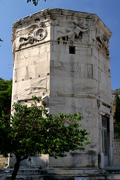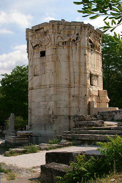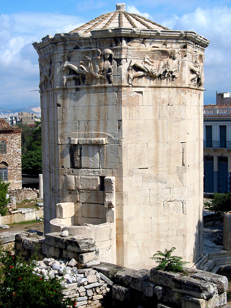 Situated at the foot of the Acropolis in the Roman agora (marketplace), the Tower of the Winds is one of the best preserved buildings of classical antiquity. It takes its name from the sculptured frieze that surrounds it, each wall of the octagonal tower presenting a personification of the eight winds, with a sundial beneath each one, the lines in the marble scarcely visible and their bronze gnomons long since lost. On the apex of the roof, as Vitruvius relates, there was a bronze weathervane in the form of the sea-god Triton who, rotating in the wind, indicated its direction by pointing to that side of the building which from the wind was blowing. Writing in the third or fourth century AD, Marcus Cetius Faventinus made a revised abridgement of Vitruvius for builders of private houses. In it, he averred that "most people assert that there are twelve winds, just as in the city of Rome there is a bronze triton with twelve busts of the winds, created in imitation of Andronikos of Kyrrhos' model. Holding his rod above the head of a wind, he shows that same wind to be blowing" (Liber Artis Architectonicae, II).