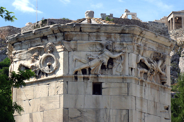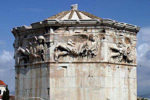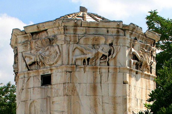 The three sides of the tower depict Notus, the bearer of rain, personified as a beardless young man pouring water from his hydria; Eurus, a stern old man wrapped warmly in his mantle, the bringer of storms; and Apeliotes, a young man holding a cloak filled with fruit and grain.