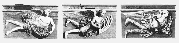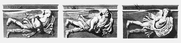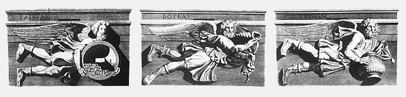 All eight winds are personified on the frieze of the Tower of the Winds in Athens, which were depicted in the eighteenth century by Stuart and Revetts.