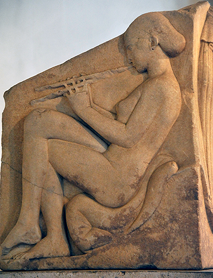 The left-hand panel of the triptych depicts a hetarai, her hair gathered in the sakkos, a mark of that class, and playing a double flute. Dated to 465-455 BC, this is one of the very first representations of the monumental female nude before the fully three-dimensional sculpture of Praxiteles. As she represents the profane aspect of the goddess, so the right-hand panel portrays a young bride putting incense on a brazier, personifying the sacred and chaste.