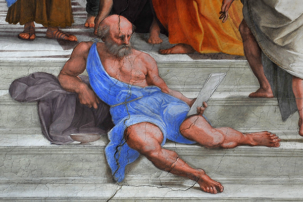Just as Waterhouse positions the philosopher next to a staircase, so Raphael places him on the stairs below the feet of Aristotle in the The School of Athens (1509-1511), a fresco that decorated one of the papal apartments of Julius II in the Vatican. Fittingly, a shadow is cast over the isolated figure.