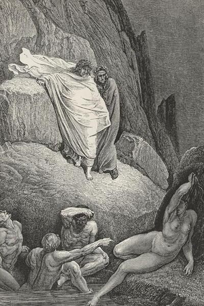 The engraving is by Gustave Doré and illustrates Dante's Divine Comedy: The Inferno. Here, in Canto XVIII.133–135, Virgil shows Dante the shade of Thaïs, where she resides in the eighth circle of Hell among the flatterers in the ordure of the second trench. This is not the courtesan of Athens, however, but a character of the same name and profession in Eunuchus ("The Eunuch," III.391-392), a popular play by Terence. Thaïs, the bona meretrix, has contrived to return a freeborn slave to her family, having one of her paramours (the stock character of the miles gloriosus or "boastful soldier") make the purchase. This he does, sending the girl to her and asking her reaction. Cicero quotes the exchange in his essay on friendship. "'Did Thais return me many thanks, say you?' An artless man would have thought it sufficient to answer 'many,' but the cunning sycophant replies, 'immense, innumerable;' for a skilful flatterer perfectly well knows that a pleasing circumstance can never be too much exaggerated in the opinion of the person upon whom he means to practise" (De Amicitia, XCVIII).