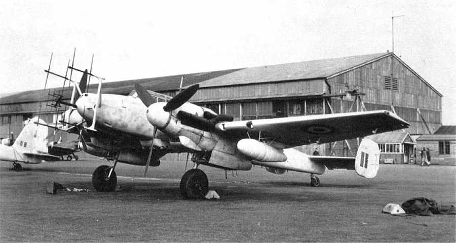 In this photograph of another war prize (WNr. 730037) on exhibit at Farnborough in late 1945, the flame dampers over the engine exhausts are readily apparent, as is the FuG 212 and SN-2b Lichtenstein radar array. Short-range performance of the newly-developed SN-2 radar initially was so poor, however, that the older FuG 212 (the smaller central array of aerials) had to be retained.