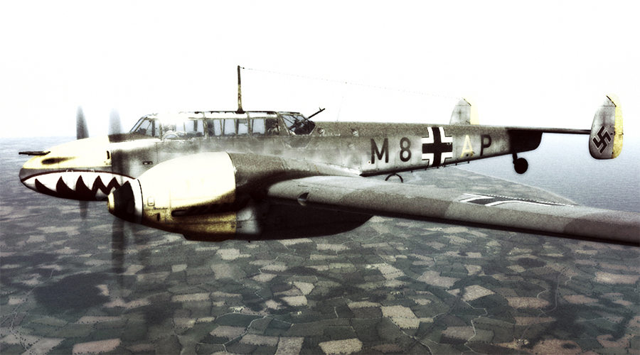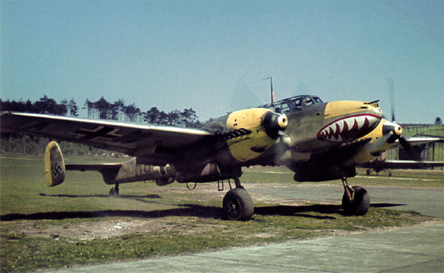 This plane is a Bf 110E, which can be readily identified by the small air intake introduced in this variant. Located between the central machine guns in the nose, it allowed air to be fed by a complicated maze of piping around the port engine and then circulated back into the cockpit to provide heating for the pilot. The gunner was warmed by another intake port on the right side of the fuselage that directed heated air from the starboard engine.