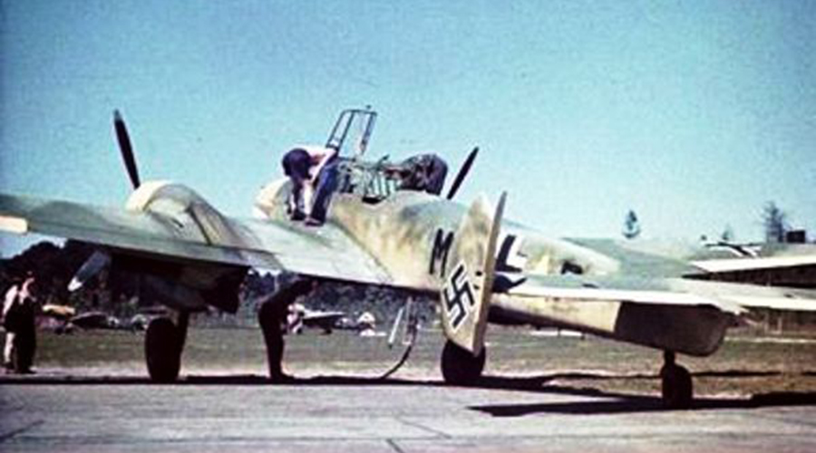 This photograph (which sometimes is colorized) shows a Bf 110 at Athens on May 14, preparatory to departing on its long flight to Mosul via Rhodes and Vichy-held Syria. Given the two massive 900-liter drop tanks beneath the wings, the plane usually is identified as a D-3. But just visible on the nose there is the air intake introduced in the E type—which also could be fitted with auxiliary fuel tanks. That series, too, was the first to utilize a thick armored wind screen and larger hubs for the main wheels, the dimpled rims of which are visible both in this picture and the color photograph of M8+A? above. Beneath the wing, the plane's identifying code has been painted over.