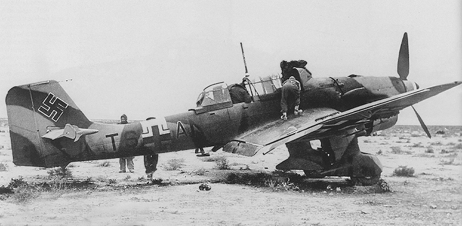 Captured in late 1941, this Ju 87B-2 is being inspected by British or Commonwealth troops in the Libyan desert. (Notice that the rear machine gun has been removed.) Operational codes could be reused and this plane, too, is designated T6+AN, T6 signifying that it was assigned to St.G 2 ("Immelmann," after Germany's first ace in World War I and the first to receive the "Blue Max"). Had the plane displayed a snake motif, one would have thought that the port side would have presented a more compelling perspective for the photographer.
