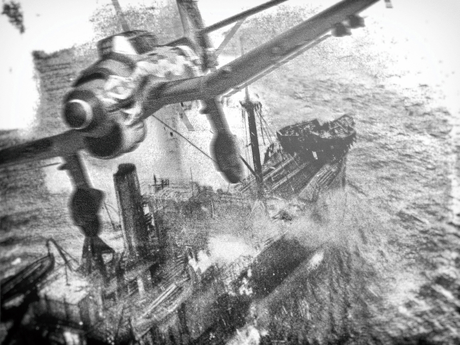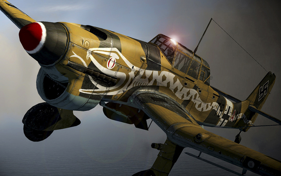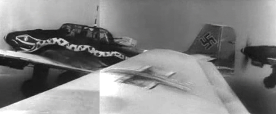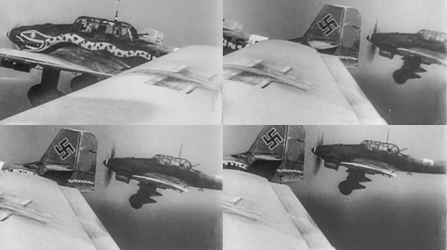 Subsequent frames progressively reveal the plane's identifying markings, from "T" to "T6" to a hint of "A" and finally to "N." "T6" indicates that the plane was from St.G 2, the "N" that it was assigned to 5 Staffel, II Gruppe—and so, 5./St.G 2. The "A" is the individual aircraft letter (outlined in white to make it more visible) in the color of its Staffel (red).