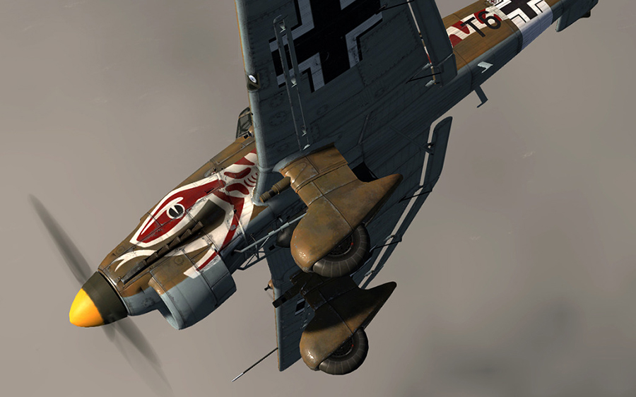This screenshot is based on illustrations in Weal, and Leonard and Jouineau, who identify the plane as an extended range R-2 of 6./St.G 2, with the identification T6+CP—a supposition that would persist until the publication of Urbanke's article in 2005. The upper surface is RLM 70/71 and the lower, RLM 78. But at the time, this too was conjecture—especially the angled jaw of the snake, which was not visible in the single photograph then available.
