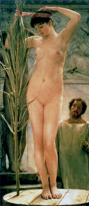 A Sculptor's Model was commissioned by the father of the painter John Collier as an academic life study. Painted by Lawrence Alma-Tadema in 1877 and exhibited the next year in Liverpool, it also was an attempt to recreate the posture of the Esquiline Venus, which had been excavated in 1874 and seen by the artist on a visit to Rome the following year. (The statue is hidden behind the palm frond that supports the model's arm).